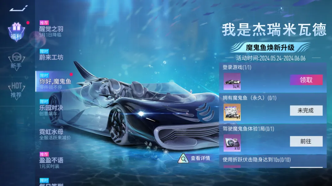 会钓鱼的策划没什么稀奇的,但“会钓鱼的赛车”各位想不想试试?5月24日,传说级干扰位车辆-魔鬼鱼焕新升级,小心别被TA钓走哦~