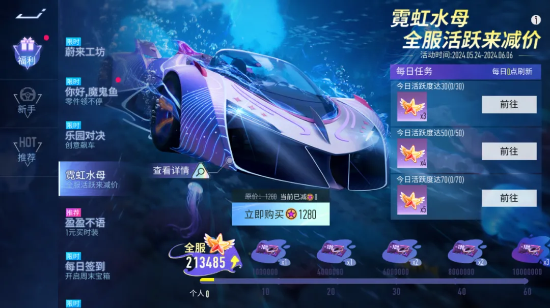 5月24日-6月6日,喊上好车友来速度节飙车,完成每日任务获得活跃星星道具。个人进度和全服进度同时达到指定目标后,就可以解锁全新涂装-霓虹水母减价卡,每张立减100纪念币,最多可获得9张哦!
