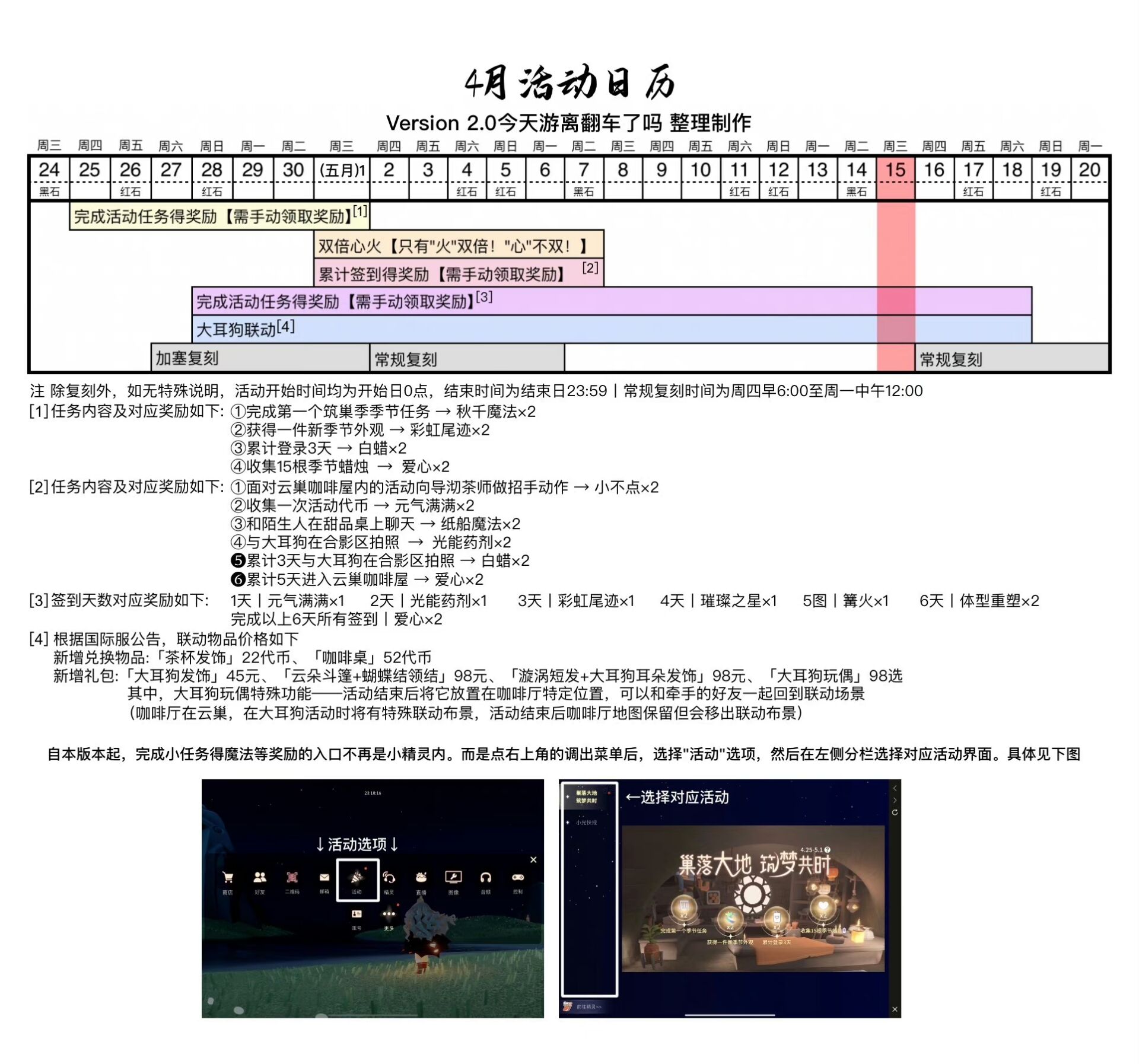 《光遇》游戏中每天的每日任务及大蜡烛的位置都不相同,玩家完成每日任务及收集大蜡烛都可以得到丰厚的兑换奖励,奖励可以用于兑换各种动作及道具,不过很多小伙伴不知道每日任务怎么做,又懒得自己去找大蜡烛的位置,我们汇总了每日任务的完成攻略以及蜡烛位置,一起来看看吧!