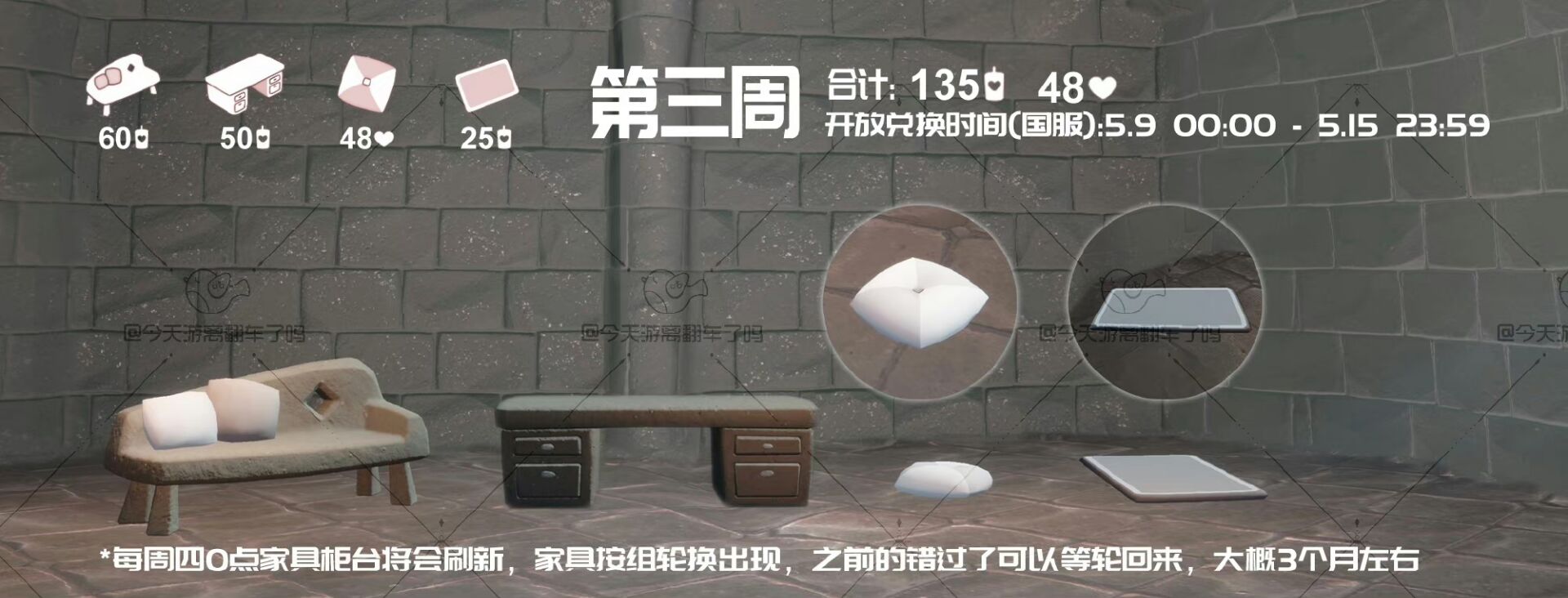 𝟭.每日免费魔法[方舟/云巢魔法商店]: (每周三)璀璨之星 𝟮.筑巢工坊家具柜台每周四刷新,距离刷新还剩0天(今天过完就刷新)。本周家具:抱枕长椅、四抽屉长柜、异色抱枕、白边框小地毯 𝟮.筑巢季季节任务三已开放