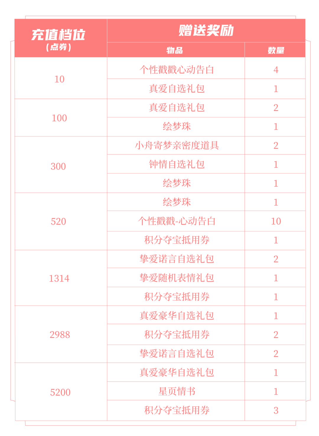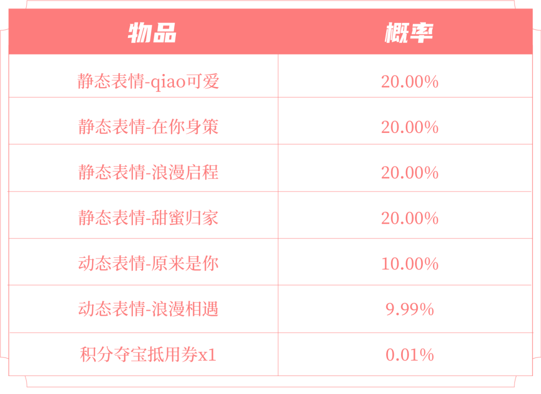 ♡挚爱随机表情礼包:打开后,可随机获得以下奖励之一:静态表情-qiao可爱、静态表情-在你身策、静态表情-浪漫启程、静态表情-甜蜜归家、动态表情-原来是你、动态表情-浪漫相遇、积分夺宝抵用券x1