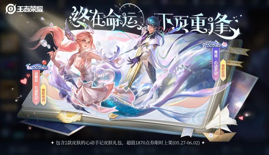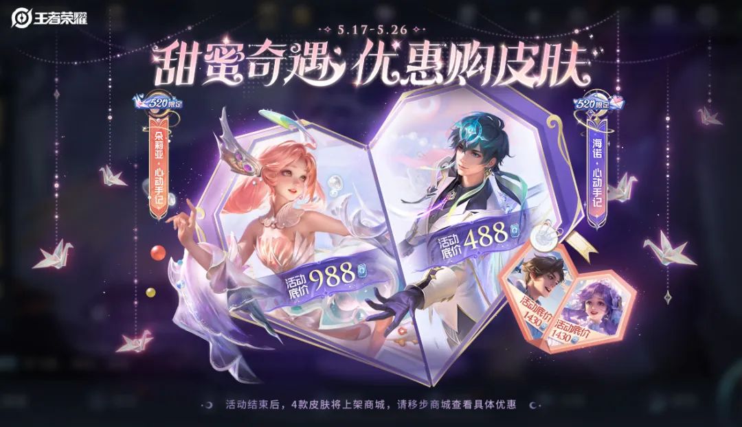 甜蜜奇遇-优惠购520皮肤活动结束后(即5月27日0点起),朵莉亚&海诺-心动手记将上架商城直售。