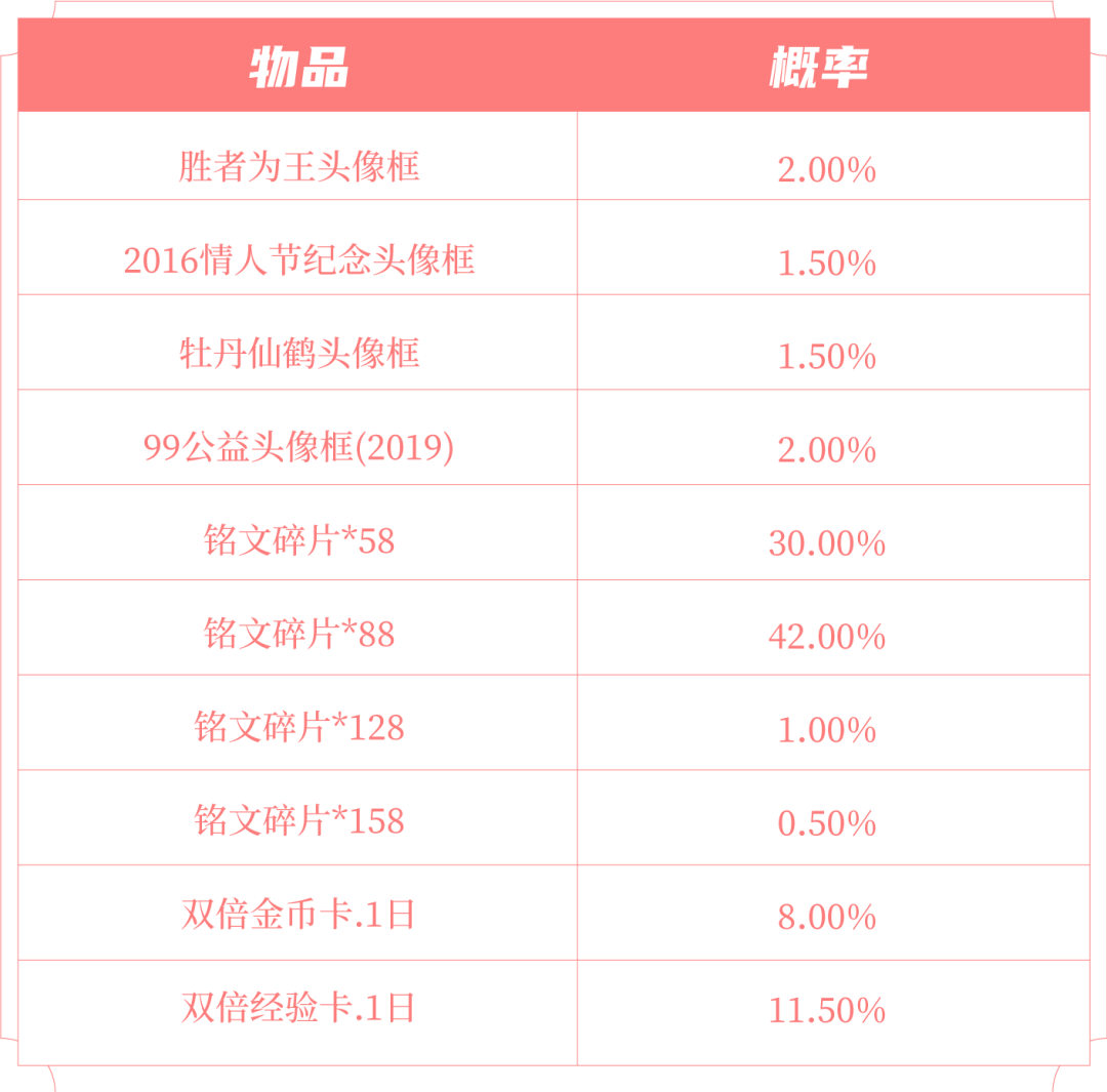 打开后可随机获得以下奖励之一:胜者为王头像框、2016情人节纪念头像框、牡丹仙鹤、99公益头像框(2019)、双倍金币卡:1日、双倍经验卡:1日、铭文碎片x158/128/88/58。