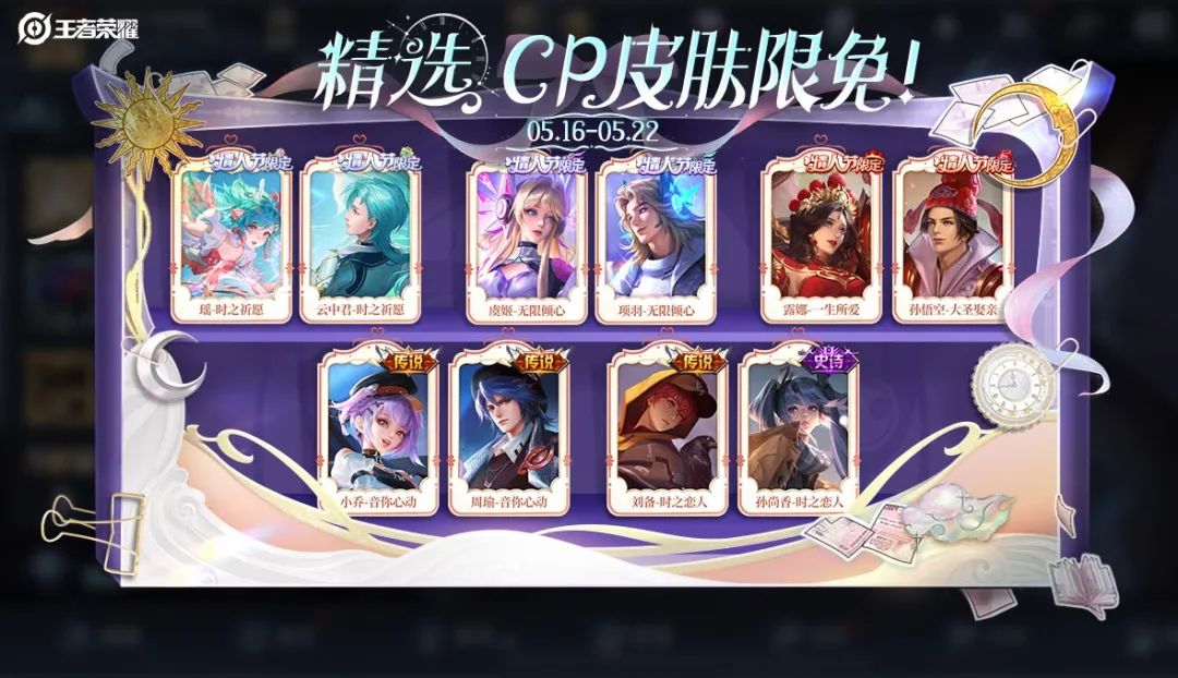 ♡限免皮肤:瑶-时之祈愿、云中君-时之祈愿、虞姬-无限倾心、项羽-无限倾心、露娜-一生所爱、孙悟空-大圣娶亲、小乔-音你心动、周瑜-音你心动、孙尚香-时之恋人、刘备-时之恋人