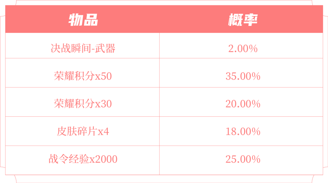 购买礼包必得酷炫机甲(1日),可额外随机获得以下之一:荣耀积分x50、荣耀积分x30、皮肤碎片x4、战令经验x2000、决战瞬间武器。累计50次必得决战瞬间-武器。
