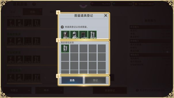 选择全部登记时,将会选择您拥有的并可以登记的道具。当您按下登记按钮时,所选道具将被登记到道具图鉴中,并且被消耗;