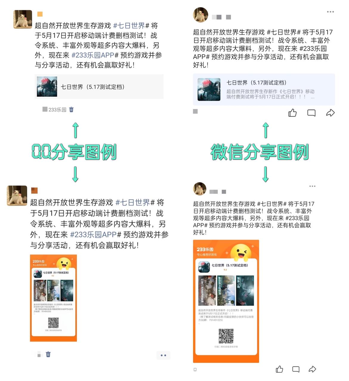 分享文案:超自然开放世界生存游戏 #七日世界# 将于5月17日开启移动端计费删档测试!战令系统、丰富外观等超多内容大爆料,另外,现在来 #233乐园APP# 预约游戏并参与分享活动,还有机会赢取好礼!