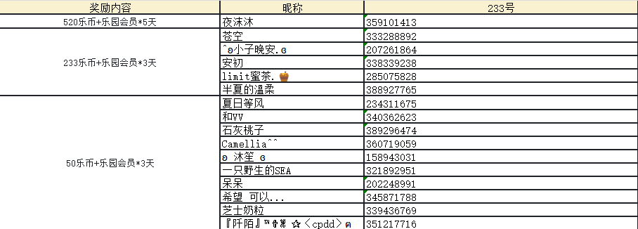 随机抽取5名玩家送出233乐币+乐园会员*3天