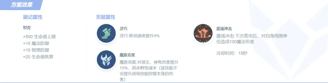 解析 选择坦克徽记强化坦度;天赋推荐灵巧提升移速,魔族克星提升打野效率,震荡冲击强化下次普攻对周围造成收益最大生命值的魔法伤害,可以提升打野效率和后期团战的输出能力。