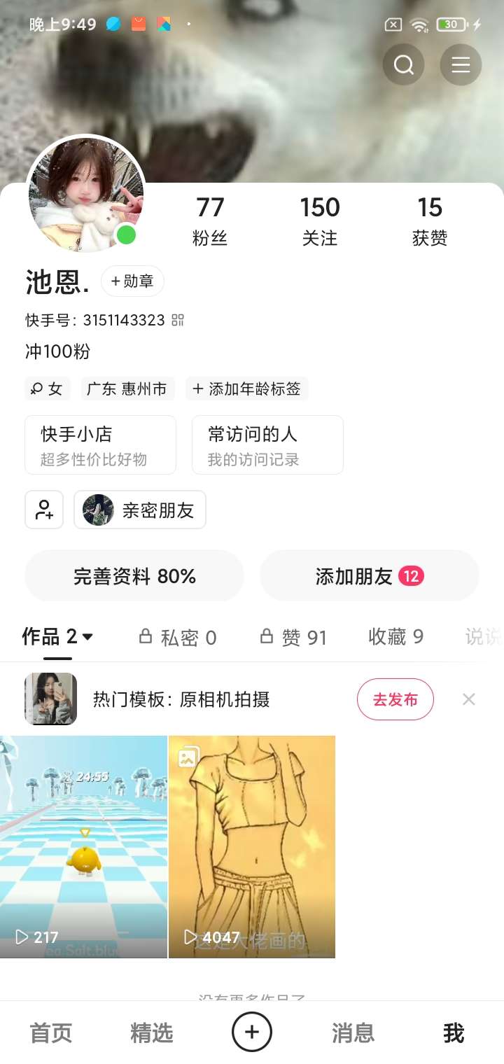 嘿嘿,有没有人加我快手啊,我想破100粉