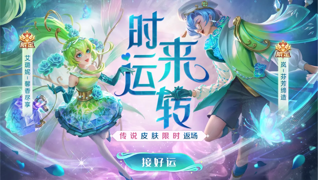 使用20龙晶购买幸运币,超值抽取传说限定皮肤艾璐妮·馨香尽享、岚·芬芳缔造等