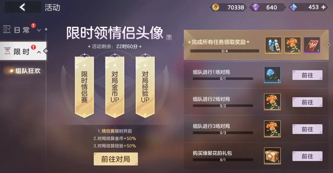 情侣赛限时开启,对局金币、经验立享加成,完成任务可得光影偕行情侣头像自选
