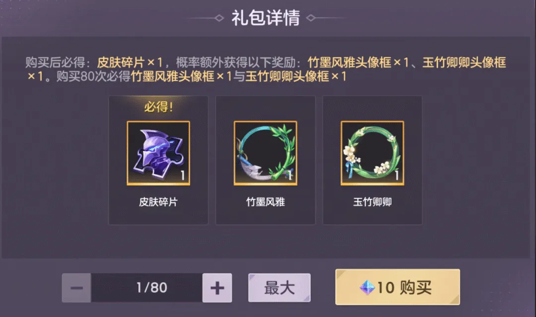 使用10龙晶购买皮肤碎片,有概率额外获得竹墨风雅头像框、玉竹卿卿头像框!最多80抽可获得以上2款限定头像框