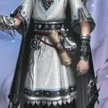 左腰侧系着记载着古老智慧的羊皮纸与装着银色液体的透明蒸馏瓶,曾造访工坊的客人会知晓那是来自神的“谶言”。右腰侧则坠着一枚漆黑的徽章,印刻其上的符号倒转着,象征着这股力量被阴翳所引导。