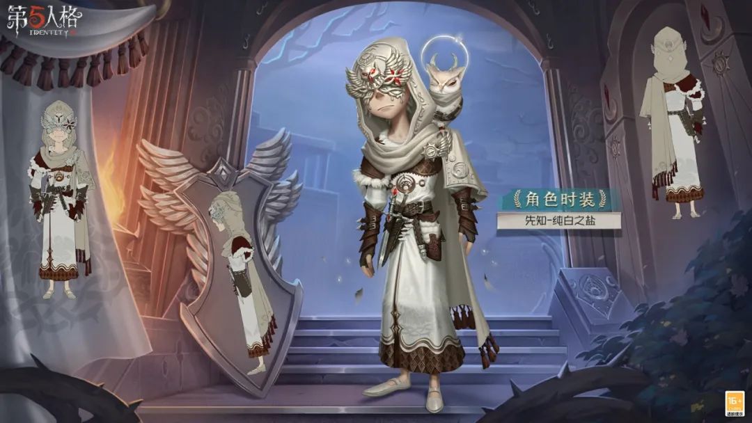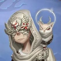 纯白帽兜上的猫头鹰睥睨着,眸子由神秘的朱红色宝石镶嵌。银白色面具遮住了双目,边缘淌下泪滴,他是最纯粹的“媒介”,而众生皆为他所怜悯。