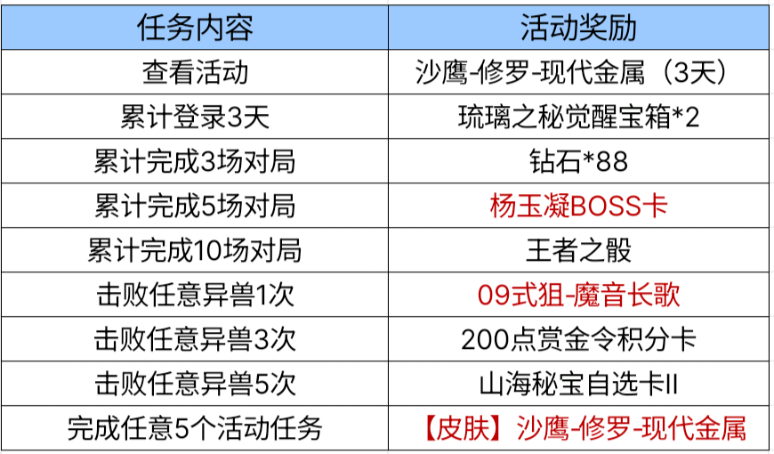 哈喽各位CFer大家好~枪战无终点,挑战亦无极限。经过大半个月的征战,想必大家已经拿下09式狙-魔音长歌觉醒、迷你玉凝等极品奖励。现在挑战日历即将翻页,全新武器阿波罗之弓、经典皮肤沙鹰-修罗-现代金属都在等你获取,快一起来看看活动详情吧!