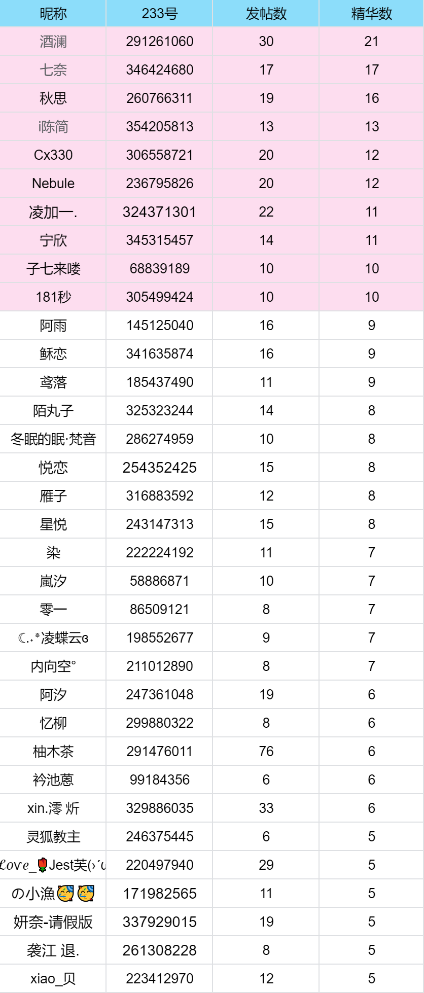 ① 最后几位精华数相同时,优先发帖活跃排名,如活跃度相同则按照总点赞量排名