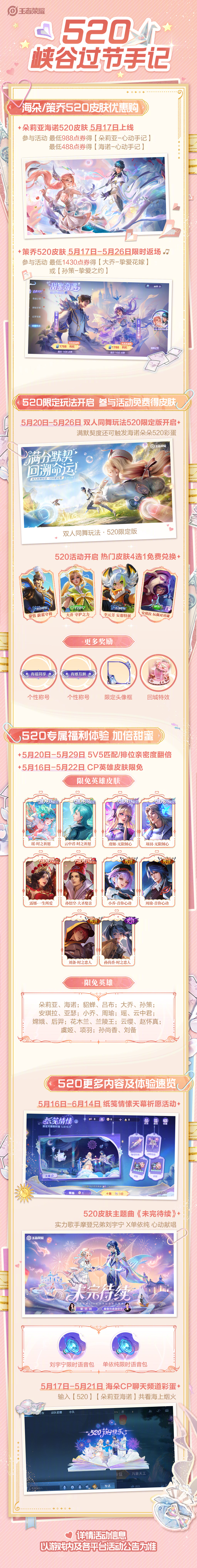 活动奖励:皮肤4选1(李元芳-妄想特派、蒙恬-蔚蓝守将、大乔-守护之力、安琪拉-玩偶对对碰)、回城特效、520奇遇手帐头像框、520局内称号、个性表情、限时语音、520亲密度道具等。