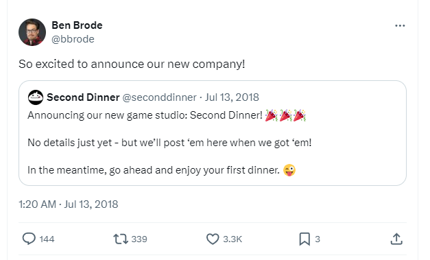 事实上,Ben Brode是先于Eric Dodds离职。在暴雪生涯的后期,Ben常常在思考一个问题:如何让卡牌对战在保留其策略深度的同时,整体节奏和体验更畅快更直接。于是,Ben带着他的思考自己家的车库里成立了全新的工作室:Second Dinner ,而新工作室的第一款项目便是BB这些年全新思考的答卷:《MARVEL SNAP》—— 比炉石更快,策略更深,随机乐趣更丰富卡牌对战手游。