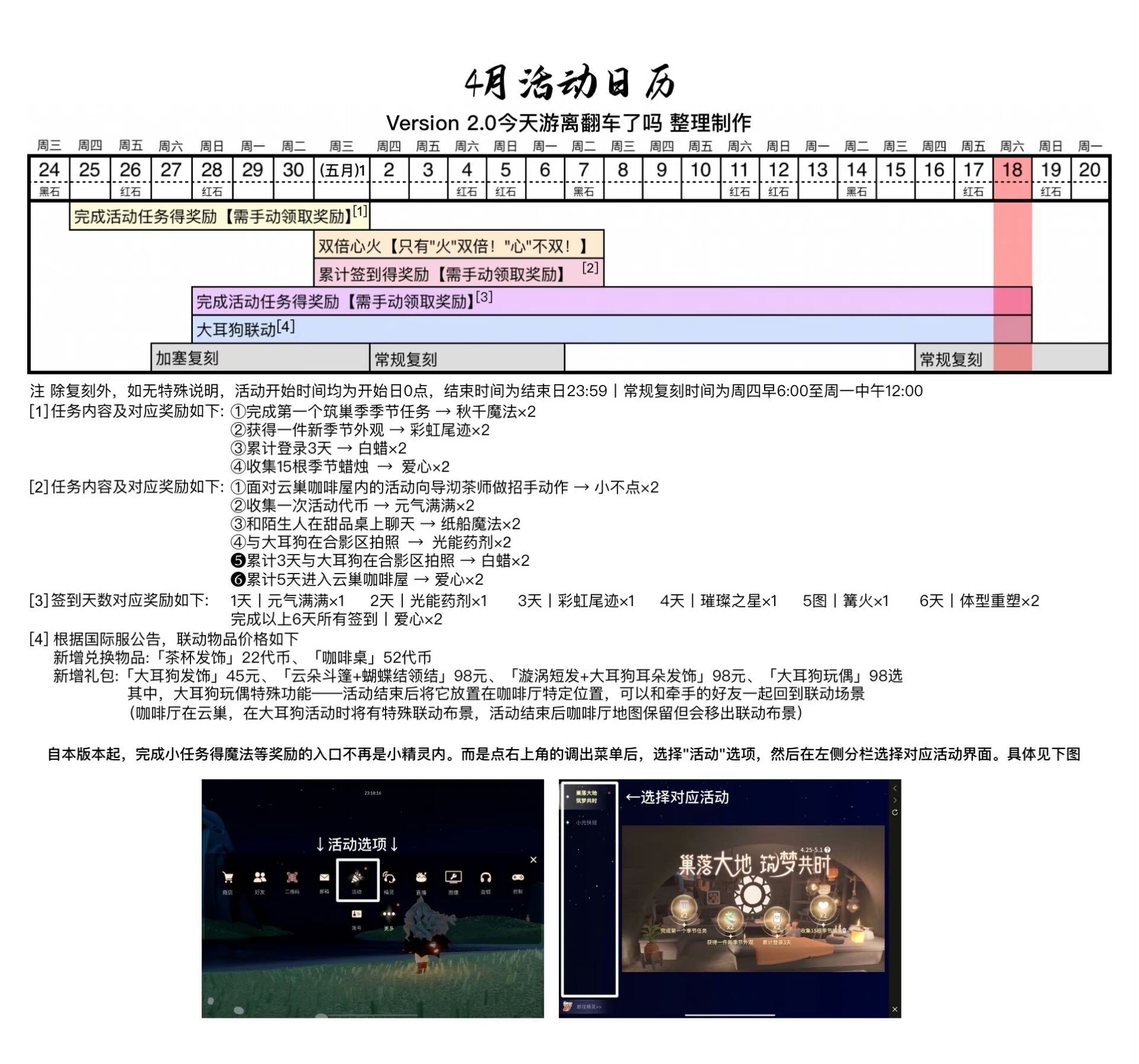 今日无黑/红石 =『日程提醒』= 𝟭.每日免费魔法[方舟/云巢魔法商店]: (每周六)长大成人、返老还童 𝟮.筑巢工坊家具柜台每周四刷新,距离下次刷新还剩4天。本周家具:单人沙发、矮脚长桌、毛巾摆件、长条纹小地毯 𝟮.筑巢季季节任务三已开放 𝟯.追光季静光学者将于下周一中午12:00离开,可兑换:三角面具、发光灯泡斗。