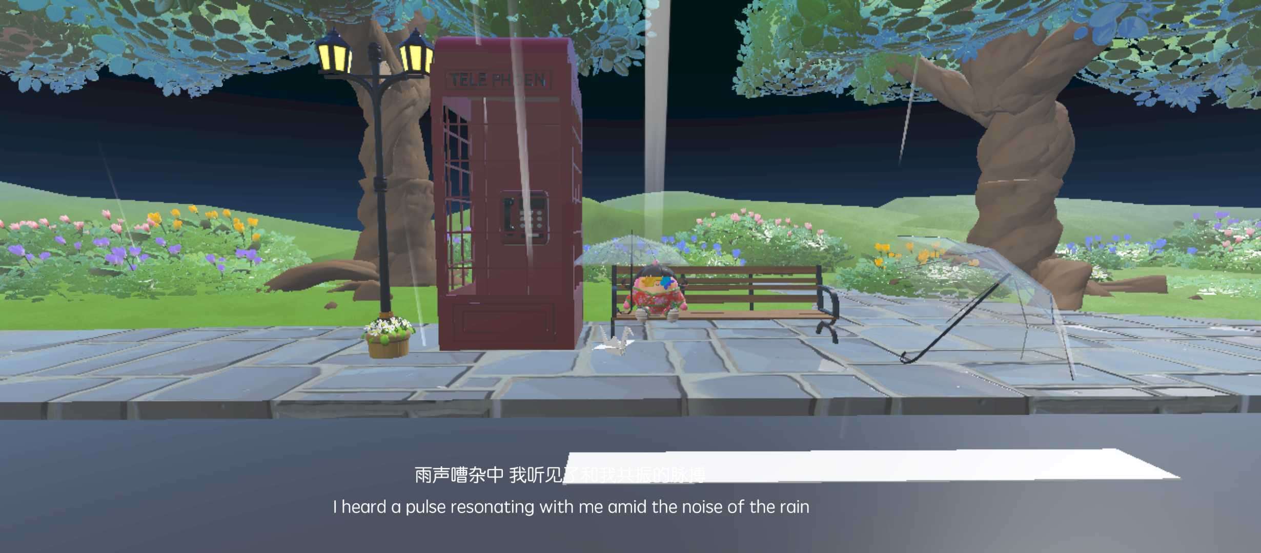 开始是在一条小路上,有两处可拍照📸打卡的地方,每一个地方都很美超级接近现实,(走到尽头小心一点,别掉下去)刚进去是晚上下雨的时候,有一种朦胧感(下雨🌧️,所以作者准备了雨伞☔,这真的超级细心爱了爱了)