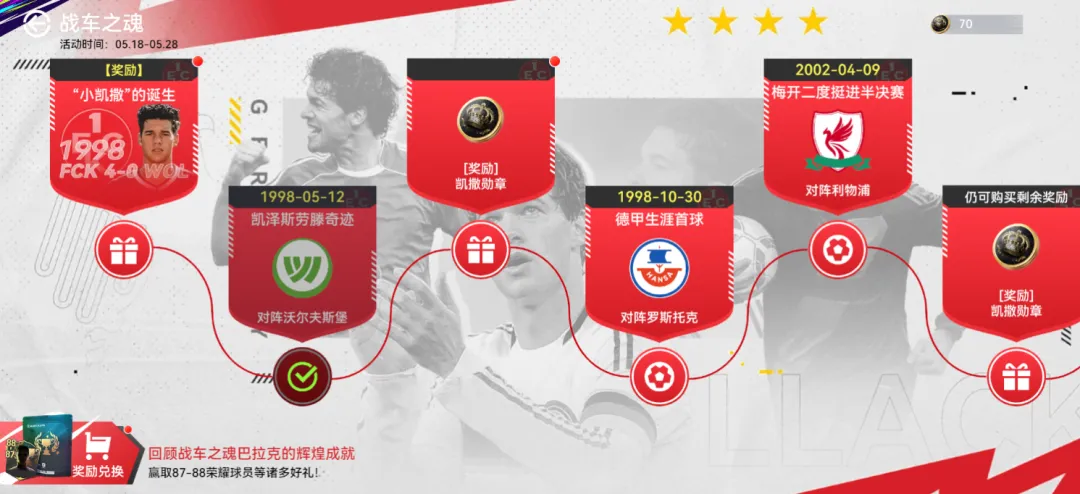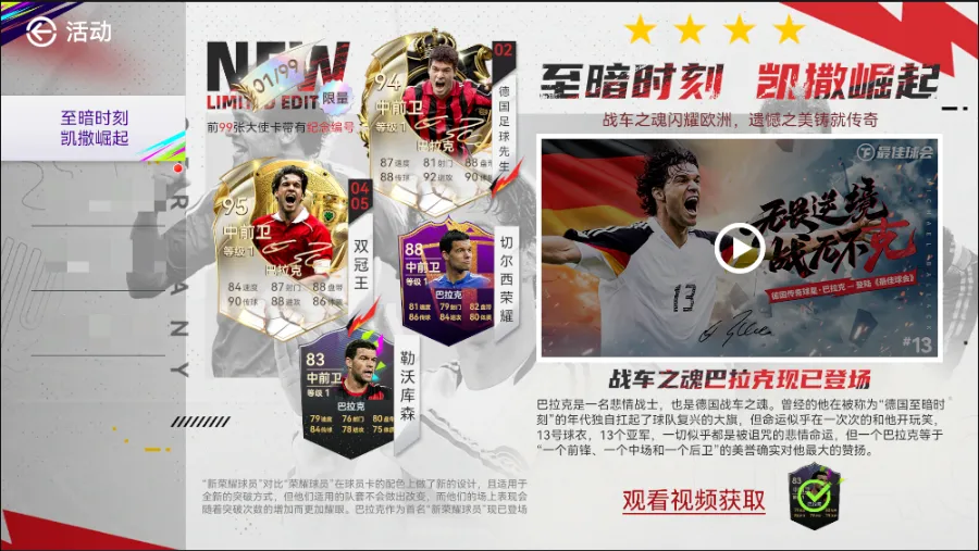 欢迎来到【战车之魂】活动,回顾战车之魂巴拉克的辉煌成就,赢取87-88荣耀球员自选等诸多好礼!按不同的路线顺序解锁超多惊喜,欧元、刷新券、各类球探卡等超值奖励应有尽有。