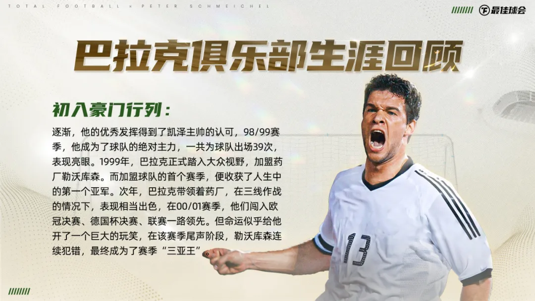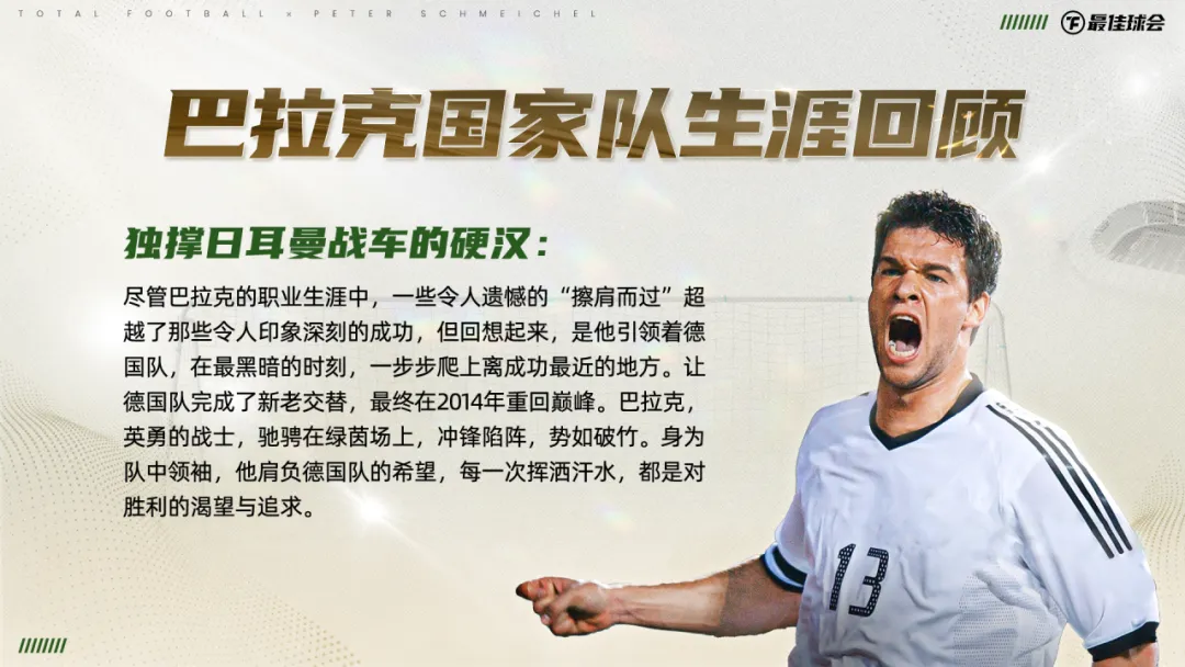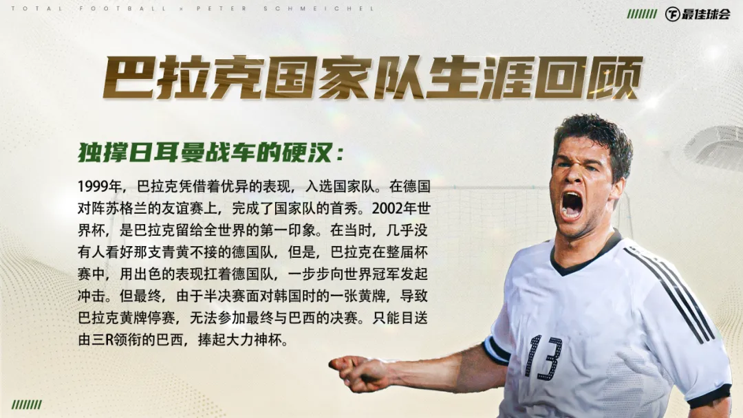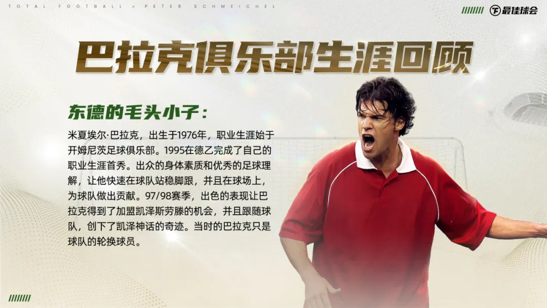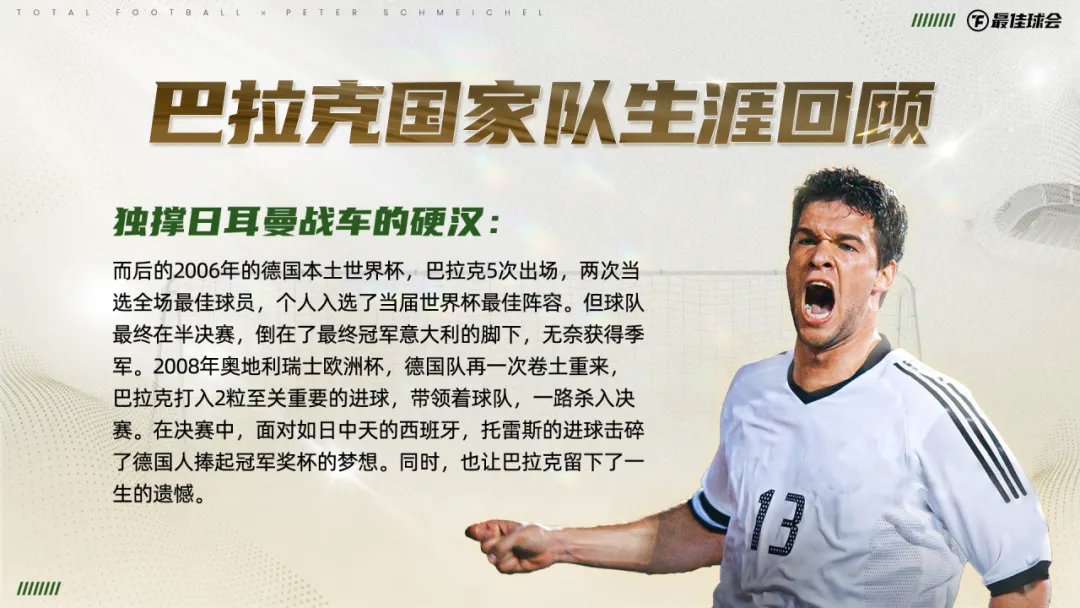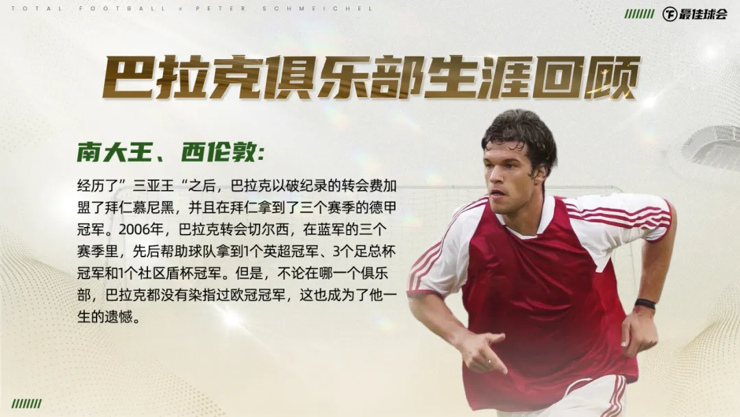他用无数的荣誉,诠释着那个时代中场位置最完美的模版。生涯194粒进球和112次助攻,体现着他在进攻方面的天赋。数不清的中场拦截和抢断,又展现出他强大的防守才华。“全能战士”就是巴拉克最好的代名词。