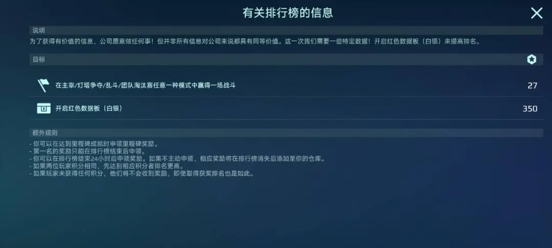 本期名为【我们需要更多数据板】的新排行榜活动即将上线游戏,此次活动的终极奖励就是一枚十分稀有的红色数据板(黄金),和往常排行榜活动规则一样,积分达成对应的里程碑进度即可获得奖励。