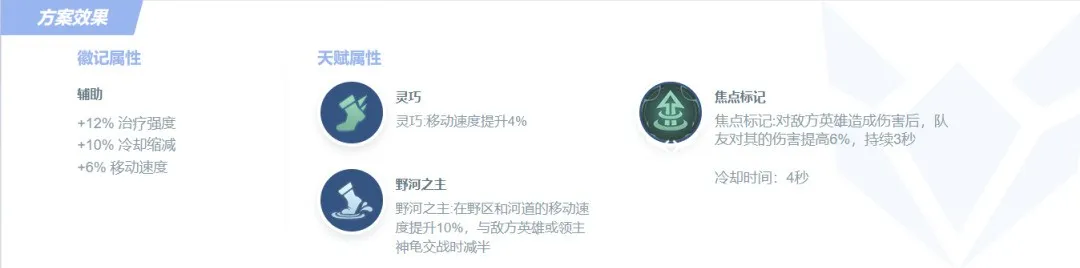 解析 选择辅助徽记,天赋灵巧、野河之主,重在减少技能CD还有支援速度,焦点标记提高和搭档的集火配合伤害,对线期打出更多优势。