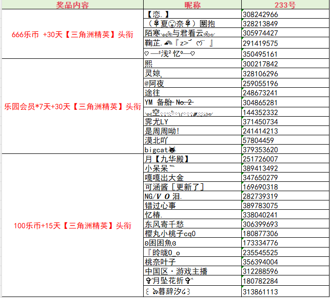 开奖啦!获奖玩家名单如下: