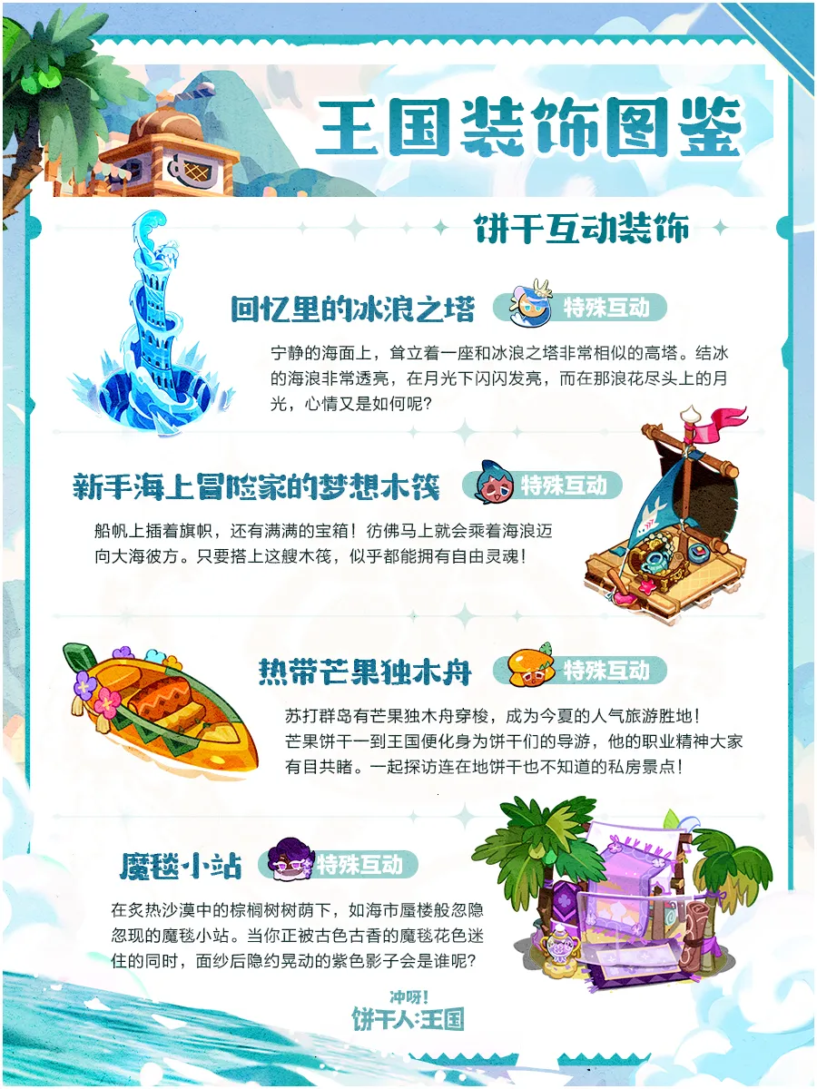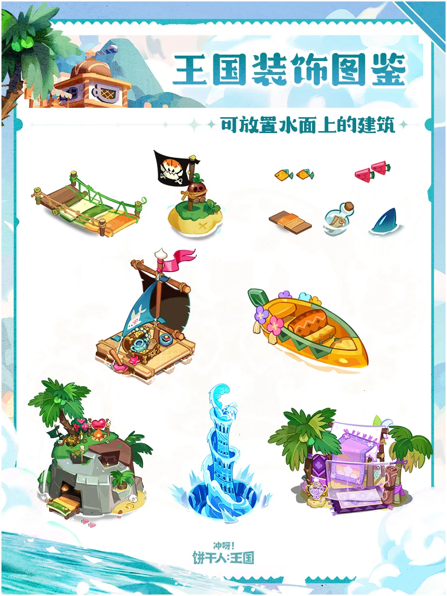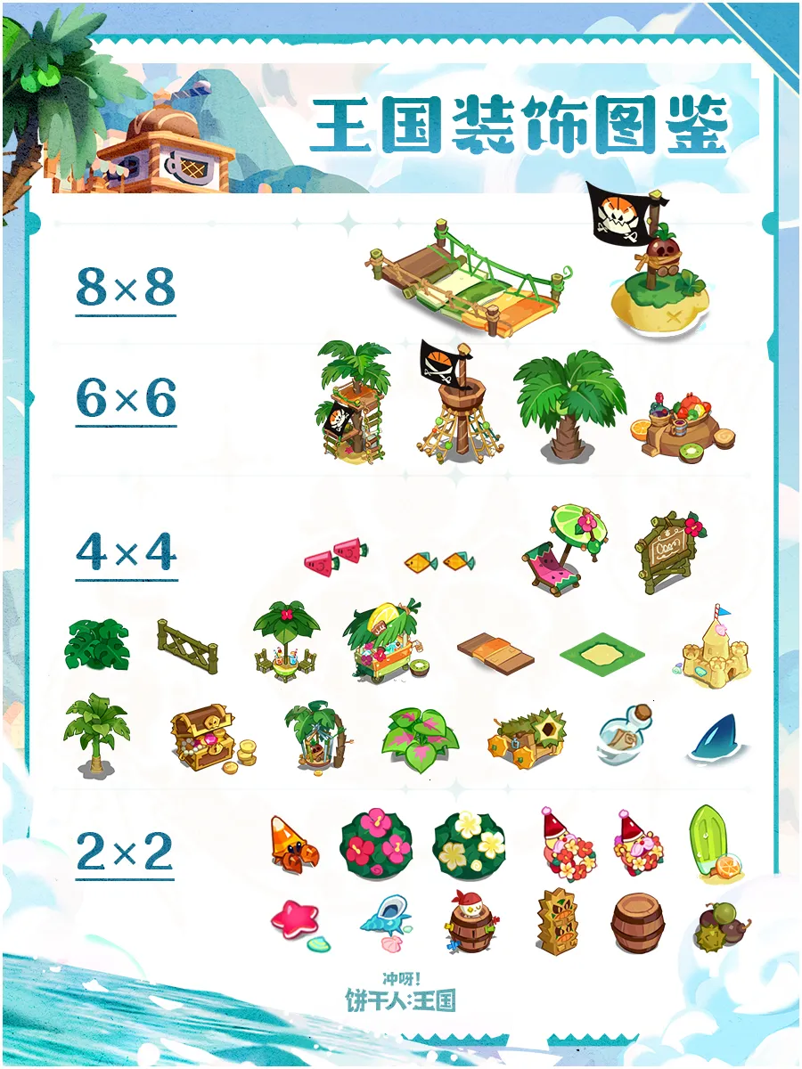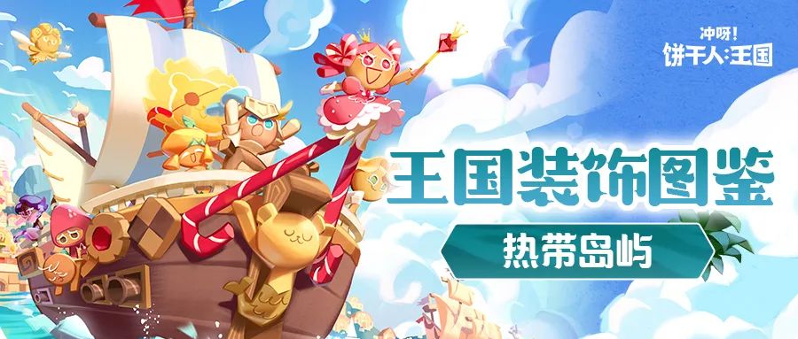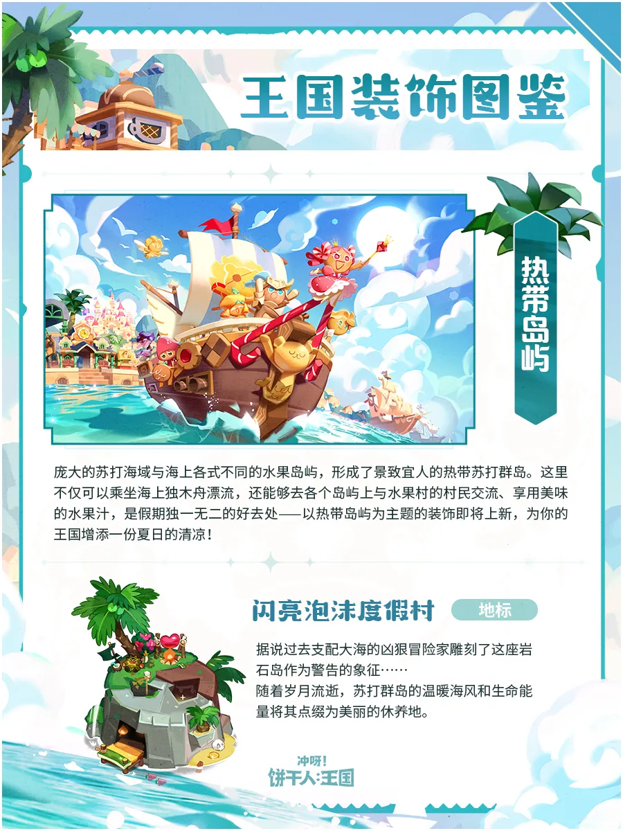 以热带岛屿为主题的装饰即将上新——现在,在饼干王国也能享受到以往专属于热带苏打群岛的别样风情,为你的王国增添一份夏日的清凉!