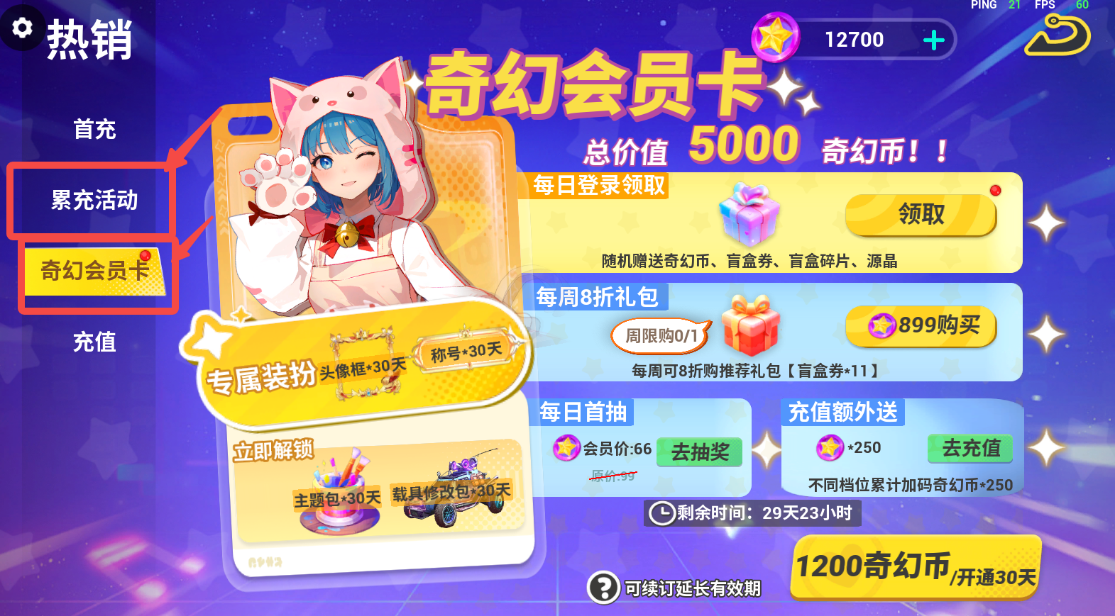 点击主界面【热销】-页签【奇幻会员卡】【累充活动】,就可以看到会员、累充活动啦
