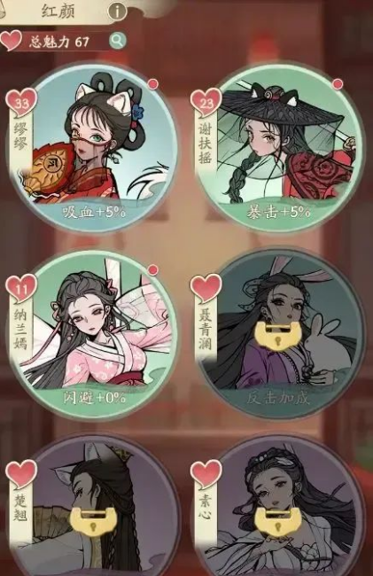 每一位红颜都有特定的属性加成,需要完成相应的解锁条件才能解锁新的,对红颜进行赠礼会提升红颜的好感度,好感度等级的提升对应的的属性和天赋也会提升,我们还可以通过消耗体力进行邀约增加好感度,体力随时间恢复。等第2天徒弟系统开放后,邀约红颜可以获得徒弟,好感度越高获得的徒弟资质越高,可以增加培养出更高的属性
