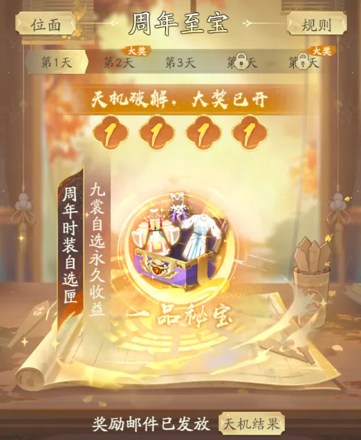 周年至宝共持续5天,每天奖励各不相同,成功破解天机笺即获得秘宝大奖。