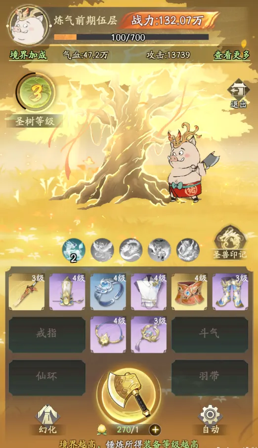 2. 获得更高级装备时,有概率获得【圣兽本源】,用于获得麒麟、天凤、金龙、穷奇、白虎圣兽的印记加持;各种流派搭配给战斗结果带来更多可能!