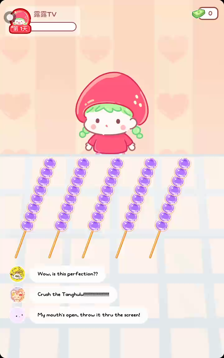 更新宠物!!! 「你进行草莓糖葫芦吃播的话,我就赞助100元。」 「脆口的声音太迷人了(°θ°)」 由于客人都被最近新开的许多糖葫芦店家抢走,曾经号称糖葫芦达人的父母因此卧病在床。 继承父母店面的主角露露开始糖葫芦吃播来宣传店面。 直到成为真正的糖葫芦达人那一天! 「今天我也要开始糖葫芦直播罗!( •o• )」 [串材料] 只有新鲜的水果的话,很难以一名吃播实况主存活下来。还要有松饼、地球软糖、青阳辣椒!利用奇特的材料制作糖葫芦吧。 [裹糖衣] 将材料串满竹签的话,就放进锅子搅动吧。唯有利用达人的秘法,才能裹出又薄又脆的糖衣。 [即时吃播] 咔哒咔哒!今天的吃播也大成功。热烈的聊天内容看起来反应也不错。看来得利用完成观众任务得到的赞助金来买新材料了! 来,准备好了吧?现在就马上挑战成为糖葫芦达人吧!