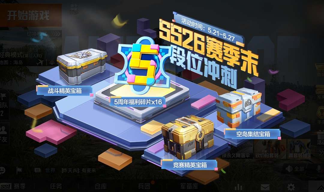 5月21日~5月27日,完成相应段位及任务,就可以领取战斗精英宝箱、5周年福利碎片×16、竞赛精英宝箱,还有空岛集结宝箱等丰厚奖励,特种兵们,快叫上好朋友一起猛猛上分叭!