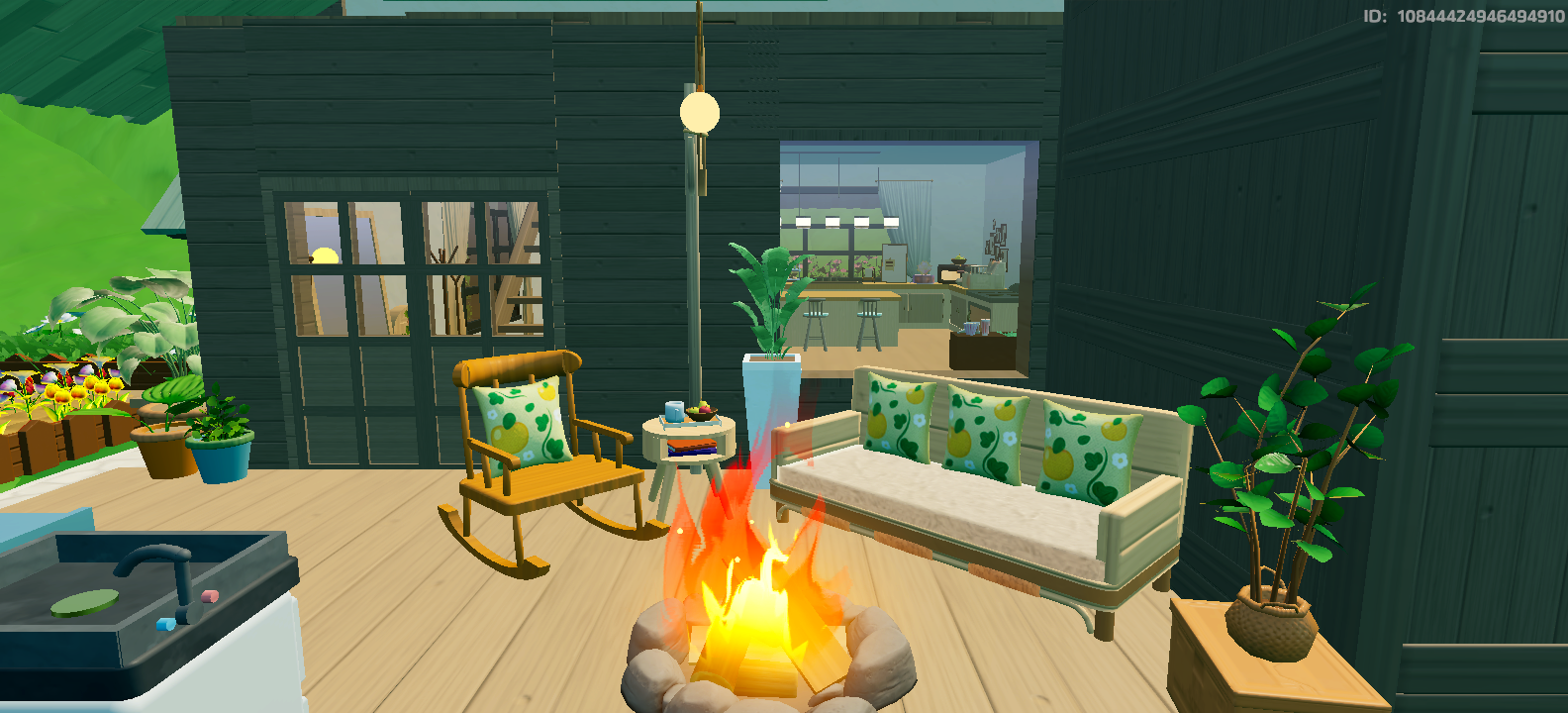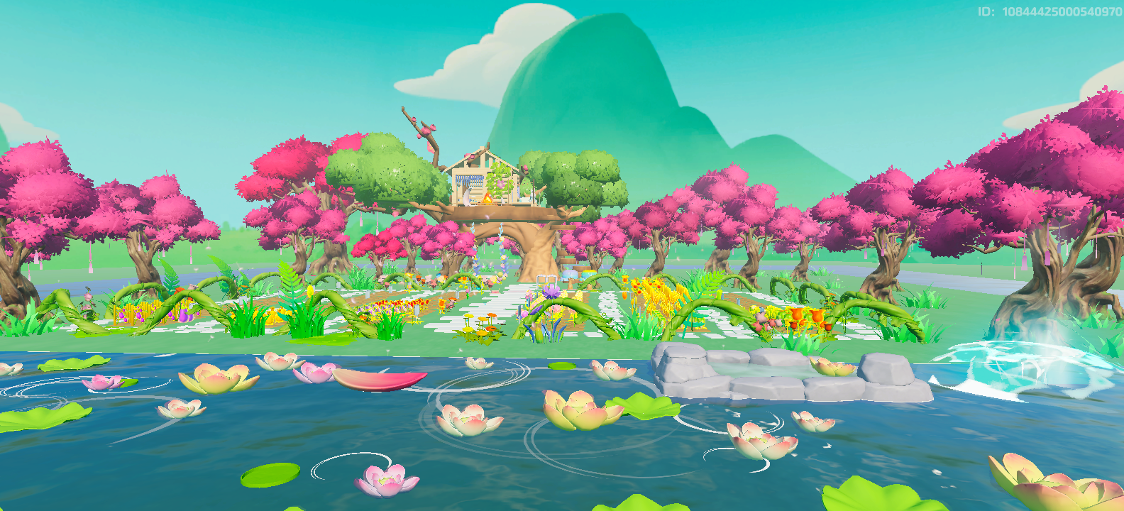石板铺设一条蜿蜒的小路,五彩缤纷的花藤从树枝上垂下来,和玫瑰交相辉映,装点出一片童话王国。小路旁边立着两扇传送门,一扇通向木屋,另一扇通向温泉,接下来就请星宝们自由选择,好好放松一下吧!
