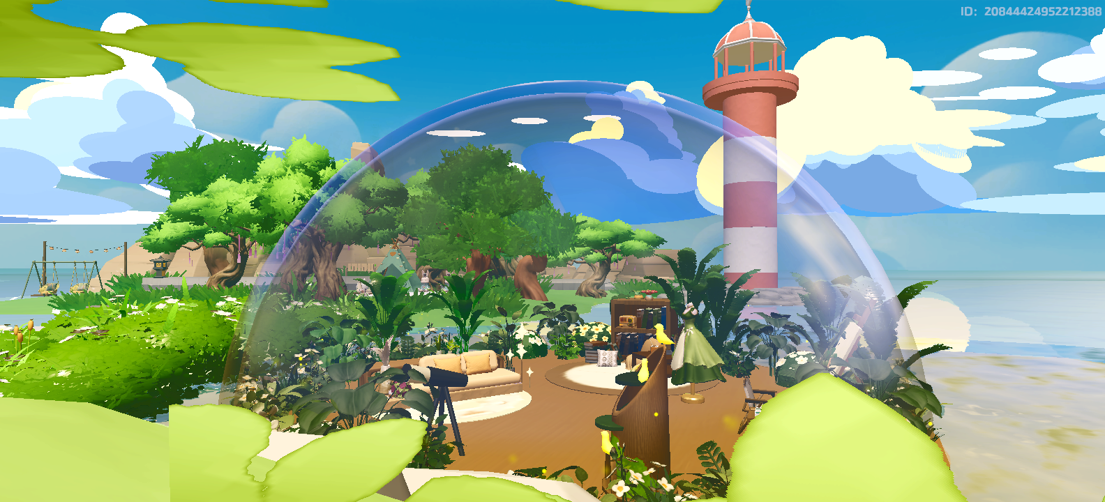 半球形的玻璃罩下是一片平坦的空地,瞭望灯塔守护着这里的安宁。无数绿植生长在玻璃罩内外,把其中的沙发和帐篷环绕起来。