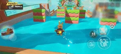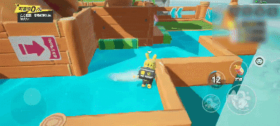 下一个关卡是一个环形弯道。弯道中有凸起的地面,星宝可以通过调整方向键和跳跃键,靠着有护栏的外侧前行,以防脚底打滑而不小心掉下去!