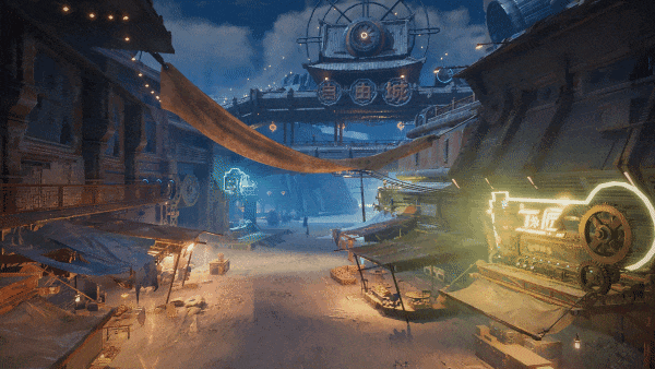 抬眸第一眼,你会看到尽显东方风情的杂货铺、茶楼、甚至惠民维修中心;再次眺望,你甚至还能将悬浮于芸芸众生之上的全息投影残像一同收于眼底。