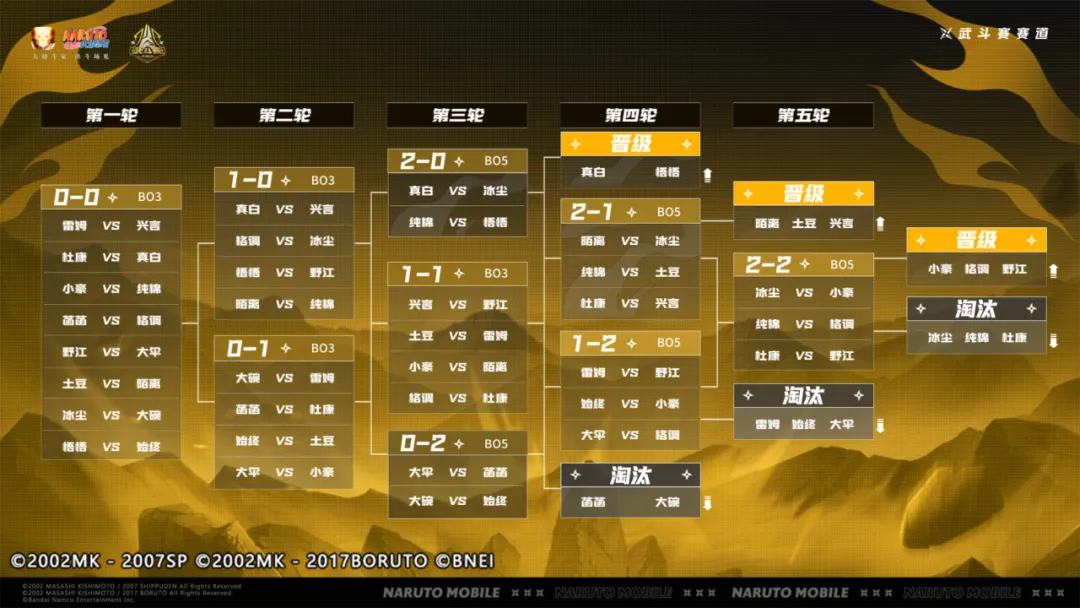 瑞士轮武斗赛赛道第三轮,悟悟、真白率先晋级决赛,其中真白的迪达拉「秽土转生」强势穿三,零封冰尘拿下胜利;选手土豆再次拿出绝活纲手「少女」残血穿三;兴言的须佐佐助零豆反三,完成绝境翻盘并最终零封野江;陌离使用无「二代目土影」实现一穿二,最终用宇智波带土「忍界大战」战胜小豪的千手扉间拿下胜利!