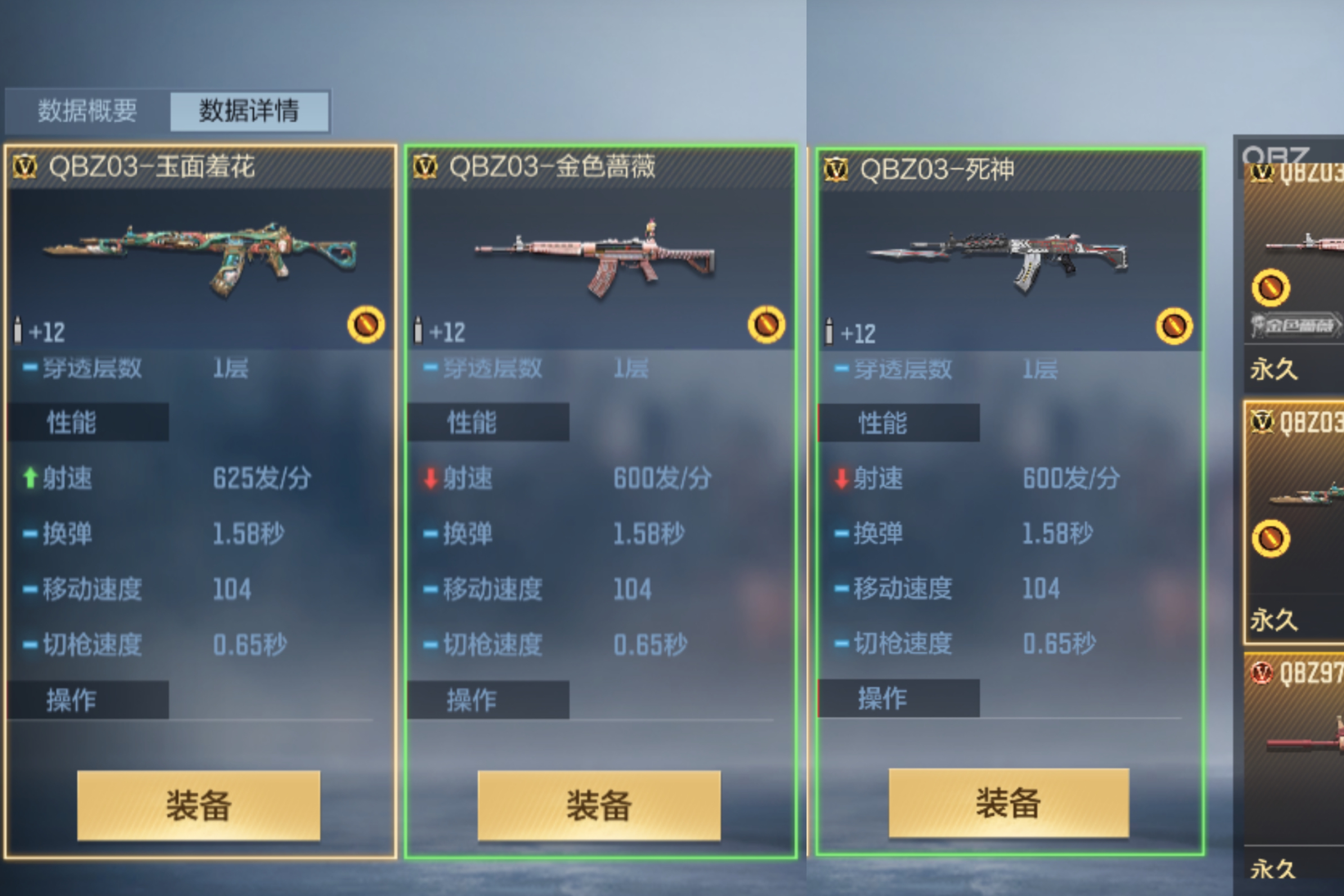 QBZ03系列的枪械并不多,在此将QBZ03-玉面羞花与QBZ03-死神以及QBZ03-金色蔷薇进行对比。