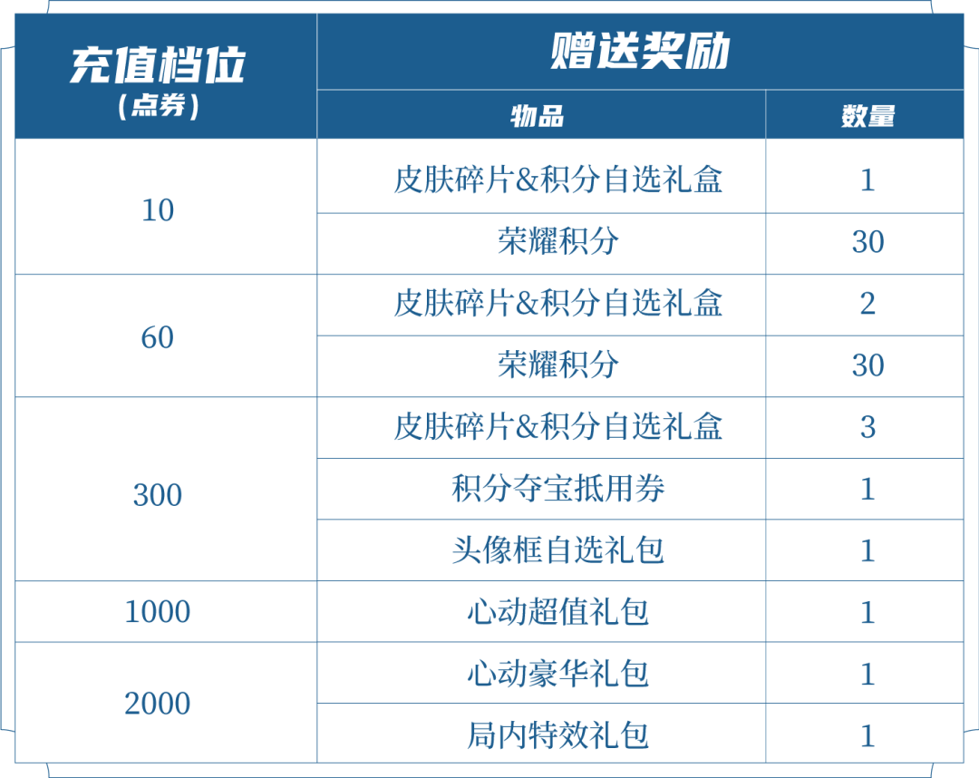 ◉皮肤碎片&积分自选礼盒:打开礼包可任意选择以下奖励之一:荣耀积分*10或皮肤碎片*1