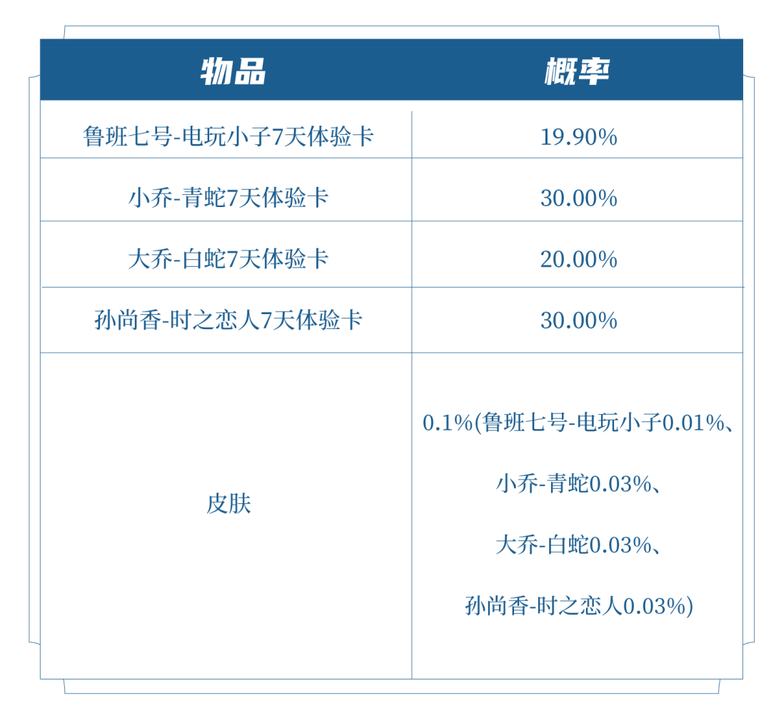 打开后必得皮肤碎片x2、铭文碎片x100和以下随机奖励之一:皮肤或皮肤体验卡(7日)1张(鲁班七号-电玩小子、小乔-青蛇、大乔-白蛇、孙尚香-时之恋人)