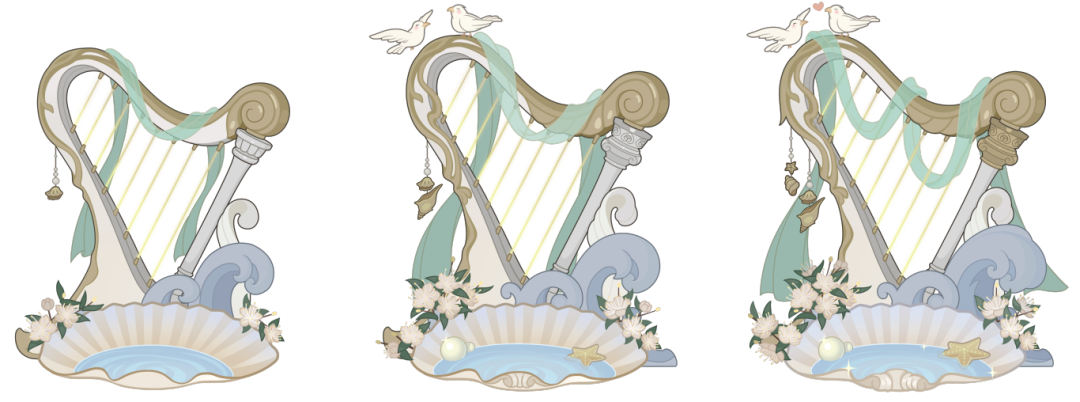 在背景设计上,把古老的神圣竖琴及女神诞生的海岸作为背景,同时以贝壳承载女神的诞生之地,KV设计也致敬了世界名画《维纳斯的诞生》,突出主题的同时又和角色皮肤相得益彰。