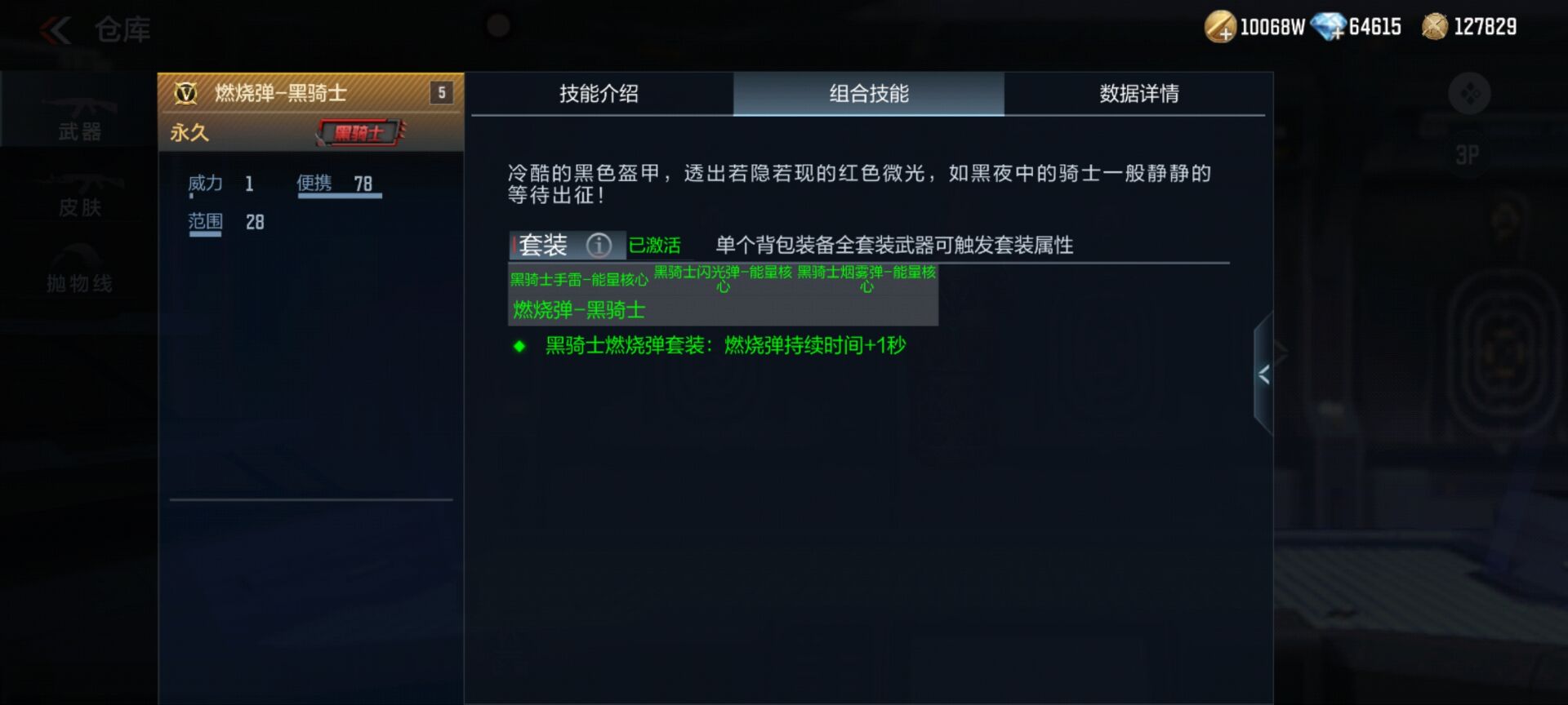 燃烧弹-黑骑士作为首款四投掷套装的套装型燃烧弹,将其与黑骑士手雷、黑骑士闪光弹、黑骑士烟雾弹三款投掷武器装备同一背包后可开启专属四投掷套装属性—燃烧弹持续时间+1秒。
