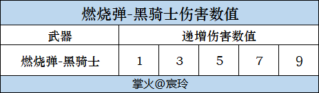首先就是威力方面,燃烧弹这款投掷武器的伤害呈现递增状态,因此燃烧弹-黑骑士与其他燃烧弹的初始伤害数值均为一,在火焰范围内将逐渐递增,递增速度相当快,可在短时间内造成巨额持续伤害。