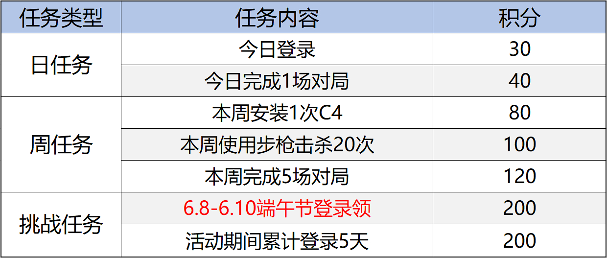参与方式:“解粽送拂影”的活动形式与之前的活跃活动形式大致相同。首先就是做任务得积分部分,本次活动设置了日常任务、周常任务、挑战任务。经计算,玩家最快仅需要7天就可以获得足够的积分。