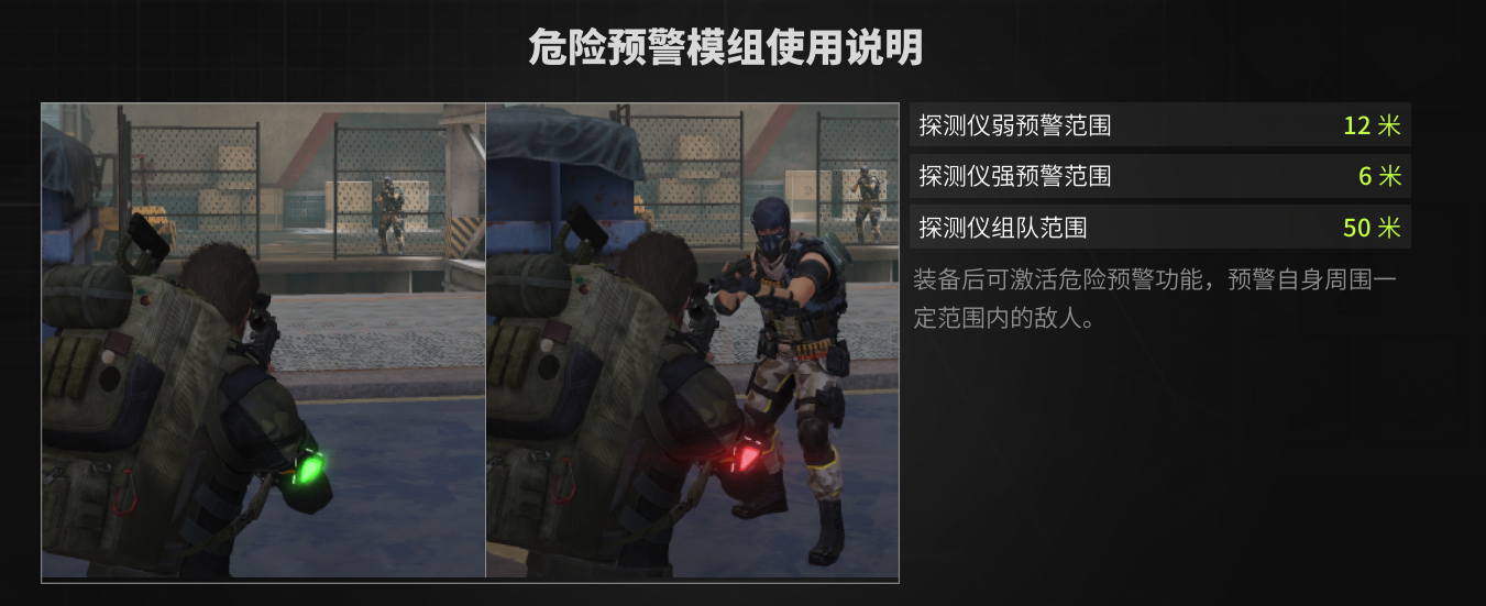 危险预警模组是萌新玩家最好用的模组,功能强大,效果直接,根据指示灯颜色可以探测周围是否有敌人,当敌人处在探测仪弱预警范围内时,下方的指示灯会显示为黄色,如果敌人进入强预警范围,指示灯会转变为红色,可以根据危险预警模组信号灯颜色和声纹等信息来判断敌人的位置。